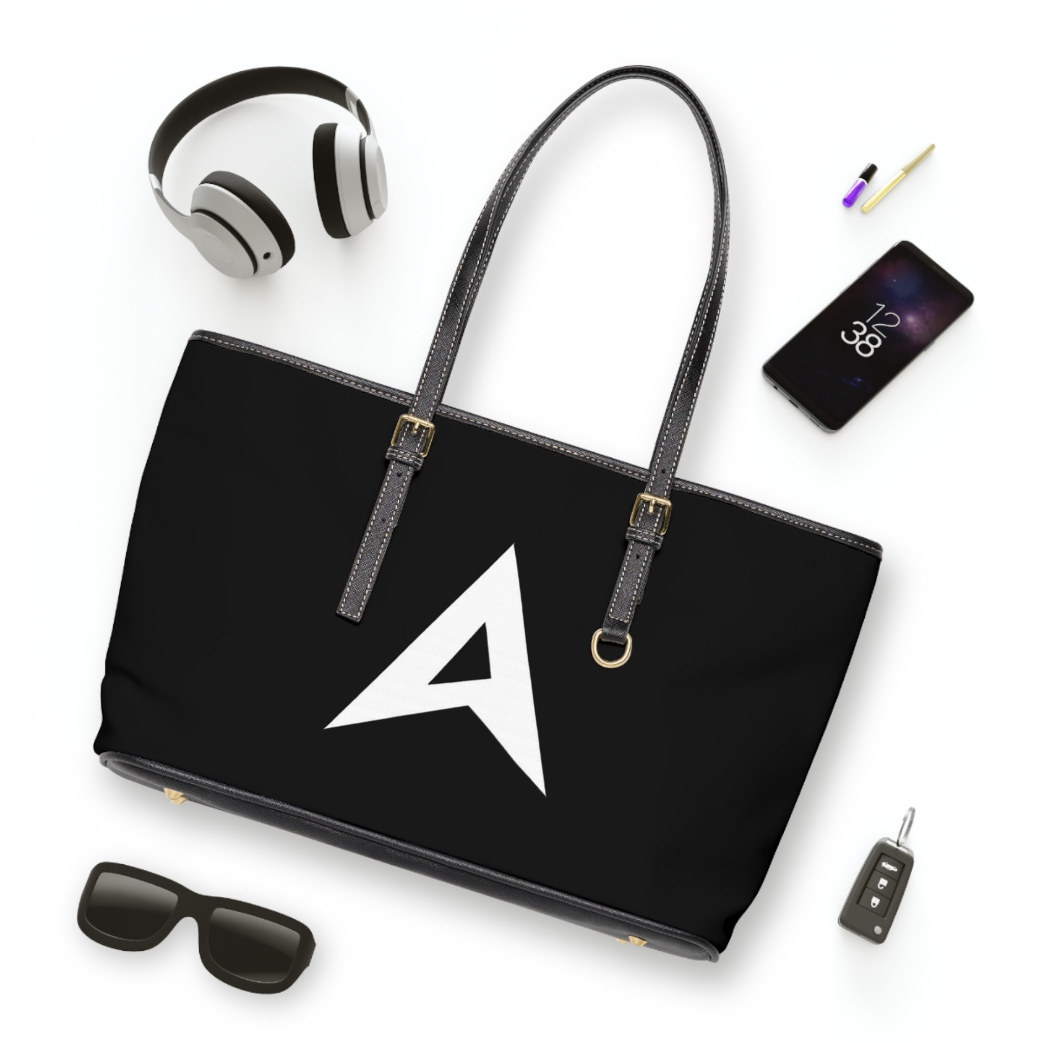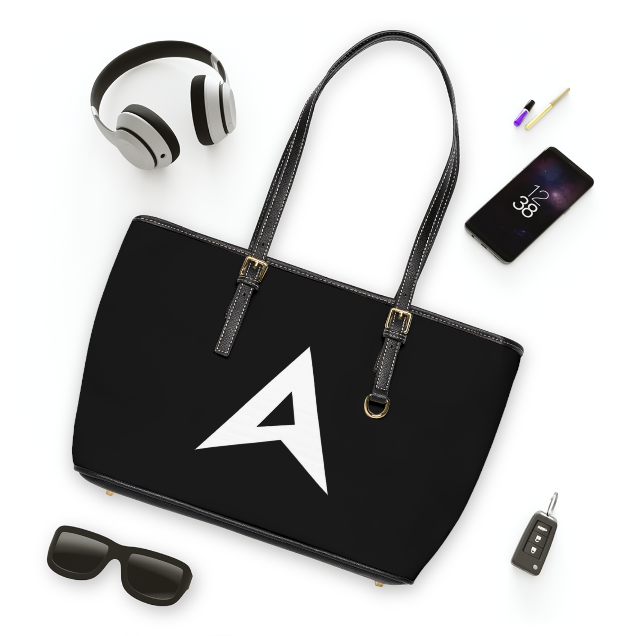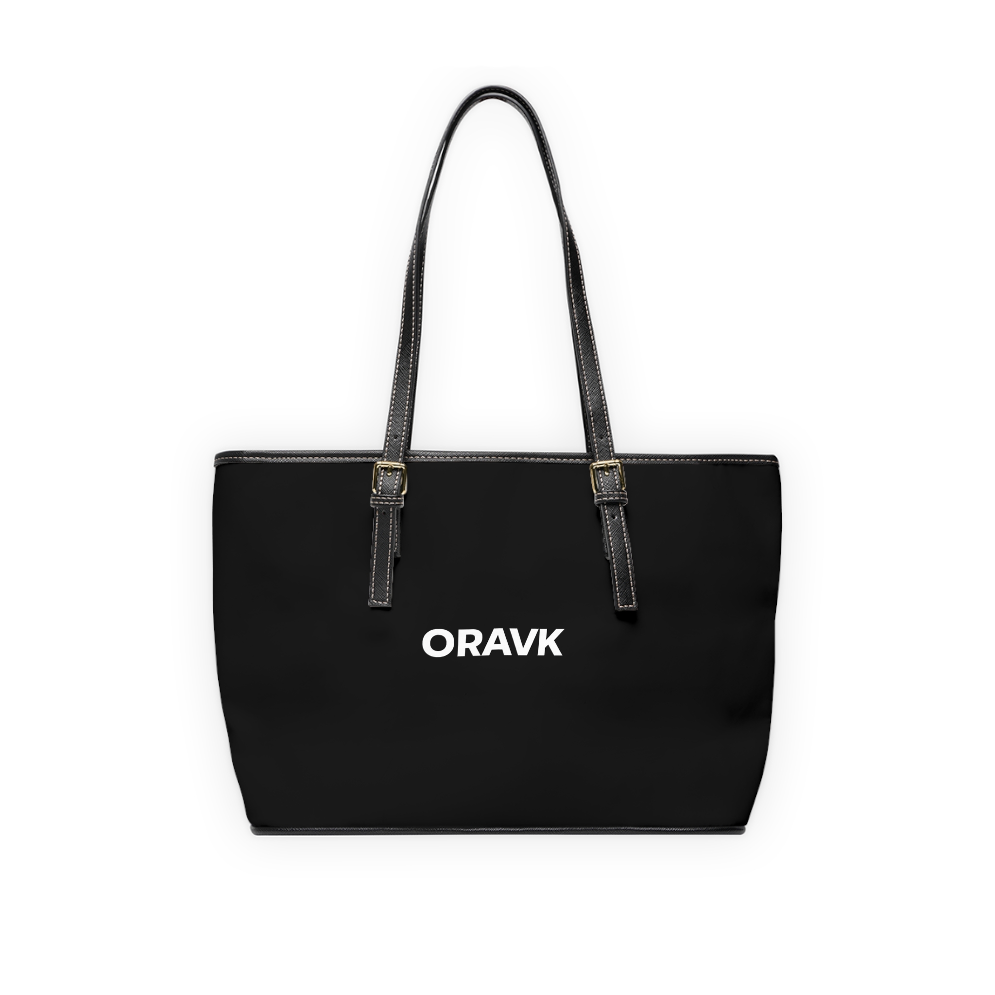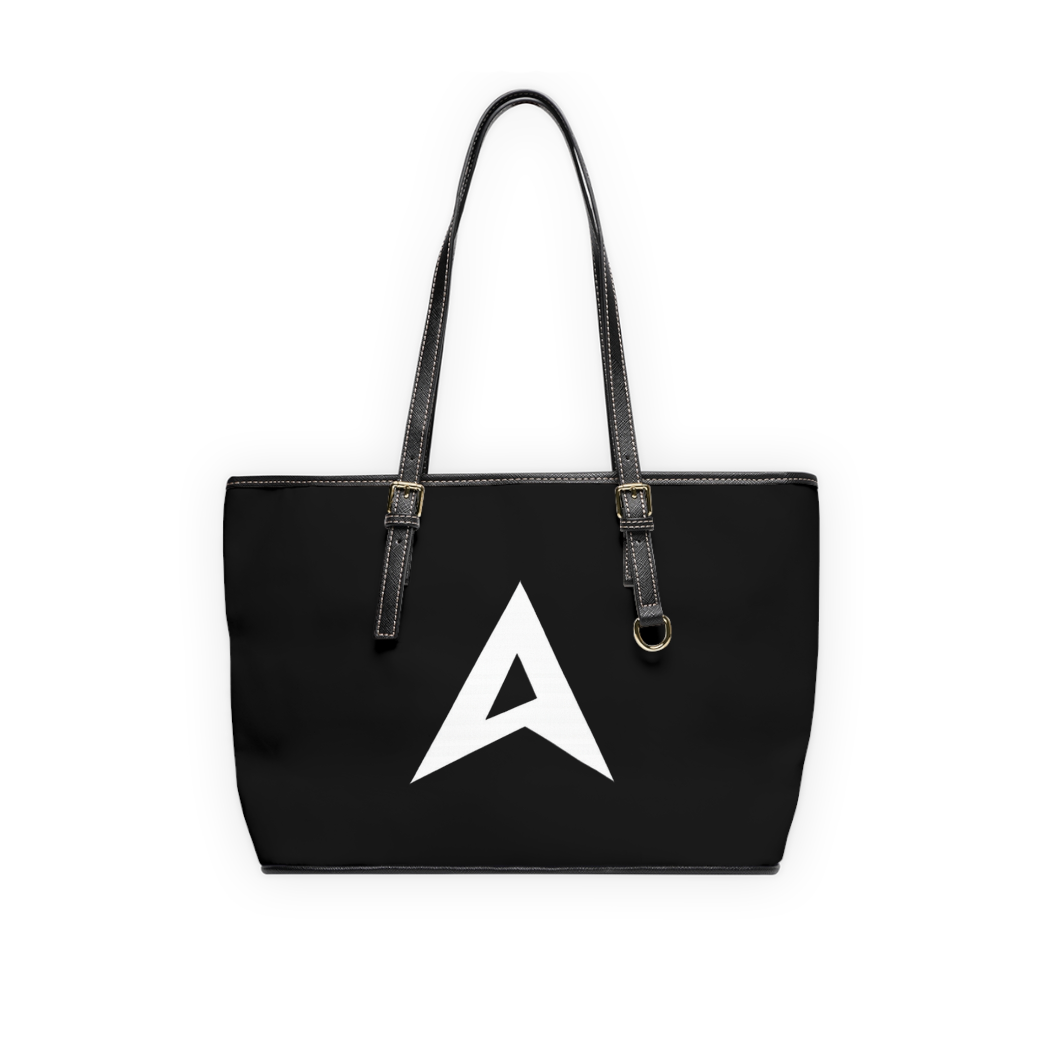 A sleek, black PU leather shoulder bag that balances bold minimalism with everyday practicality. The matte black body is accented by bright, double-sided white branding — a sharp geometric monogram on one side and a clean wordmark on the other — for a confident, modern look. Gold-colored hardware and adjustable straps add a refined touch, while a polyester-lined interior with a zip pocket and two open pockets keeps essentials organized. Available in two sizes, this bag carries work files, a tablet, or weekend essentials with equal ease, slipping naturally from morning commute to after-hours plans.