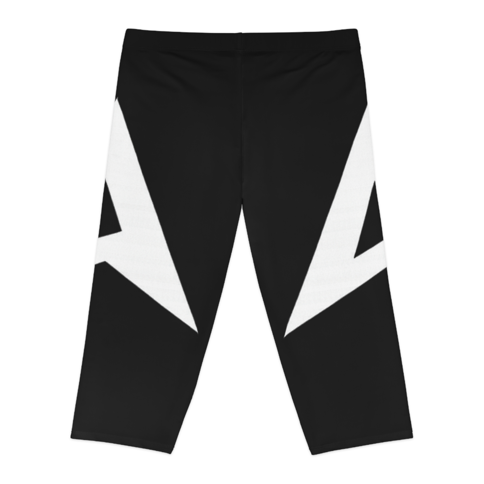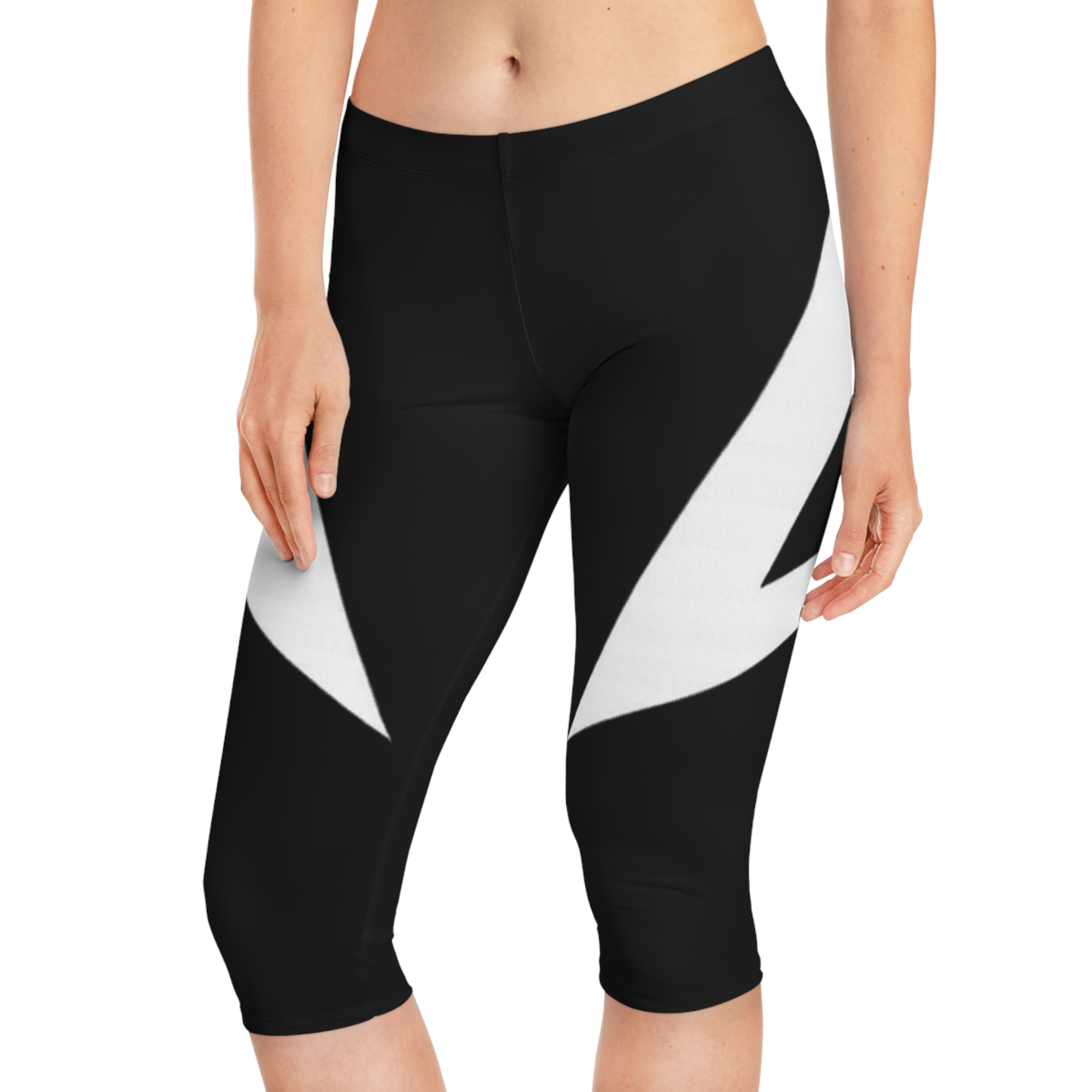 These knee-length capri leggings bring clean, modern energy to your everyday movement. The high-contrast, minimalist print creates bold triangular accents at the outer thighs, so the design reads like a confident, architectural detail whether you’re stretching in yoga or stepping out for coffee. The mid-rise elastic waistband and smooth, seam-reduced construction keep the silhouette sleek and forgiving. Lightweight yet supportive, they move with you — from morning flows to errands — while remaining crisp and easy to style with monochrome layers or bright pops of color.
